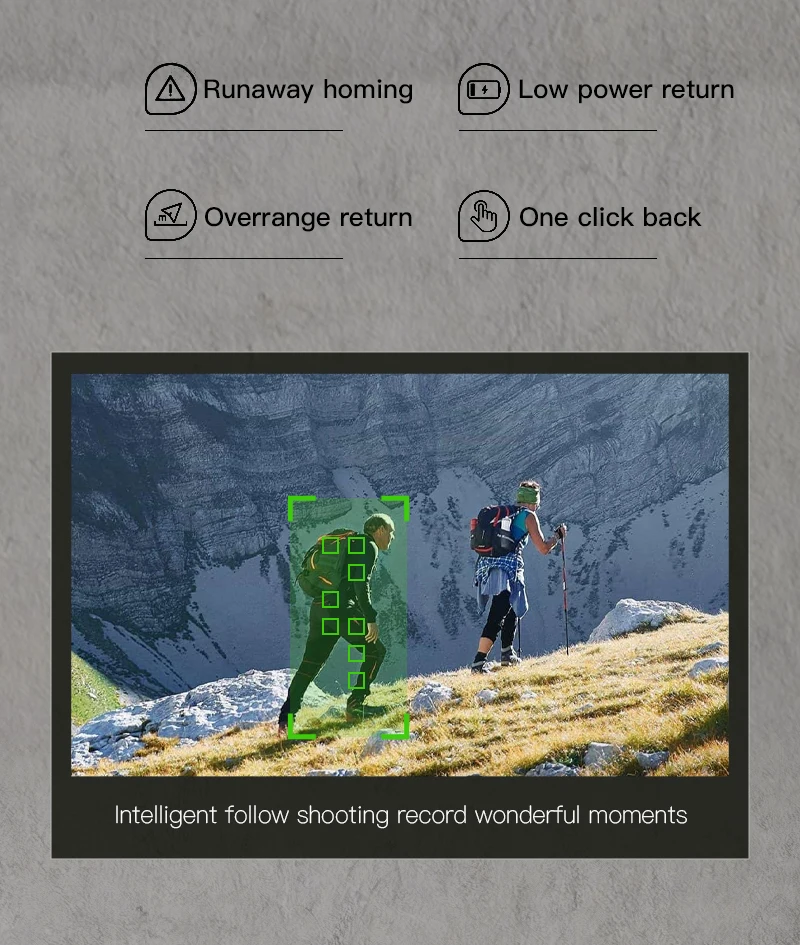 2、①GPS intelligent follow: after the aircraft link GPS, open the APP follow function, the aircraft follow the mobile phone movement. ② Image follow: 1-5m from the aircraft to identify the shooting object and automatically follow the flight.